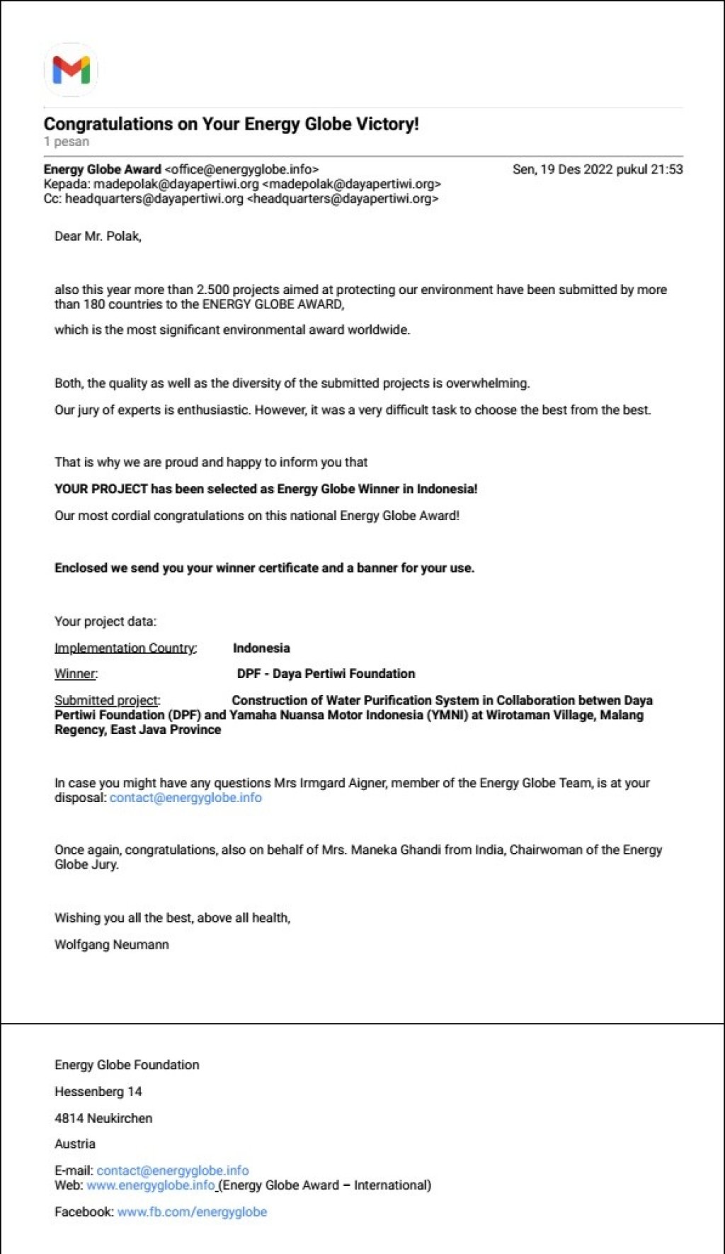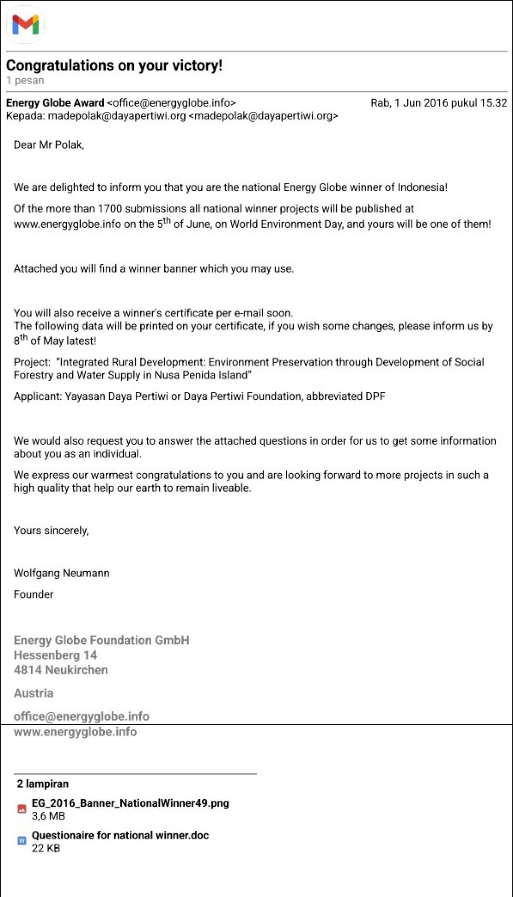 One of the villages (Sidorejo) where DPF works was chosen in the past as a pilot by the government in Environmental Planning and Development at the Regional Level presented by the government at UNCRD, Nagoya, and used as a guide for field extension workers in other countries. DPF received several national awards and an Energy Globe Award and other awards in the field of community forestry and water.